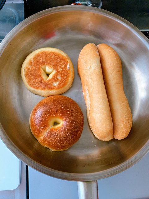 플렌 베이글과 미니 바케뜨(부드러운) 반을 갈라 팬에 살짝 따스하게