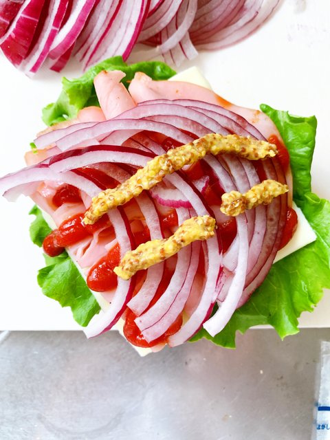 구운 후 마요네즈를 발라주고 슬라이스 햄과 치즈, 양파, 상추, 케찹으로 쌓아올려 뚜껑 닫으면