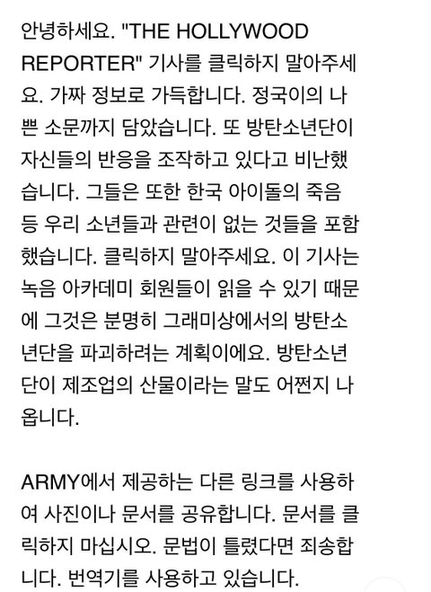 우선 이번 기사는 애들에 관해서 완전 부정적 쓴 기사야. 그래서 조회수 늘리지말아달라고 해외아미들이 엄청 부탁하고 강조하고 있는데 계속 늘고 있어서 나도 같이 부탁하려해ㅠ 제발 기사 링크 눌러보지말아줘. 이 잡지는 아카데ㅁㅣ 회원들이 보는 공신력 있는 잡지라서 조회수가 늘면 그램2에 큰 영향을 줄 수 있어. 아마 그걸 노린 걸거야.