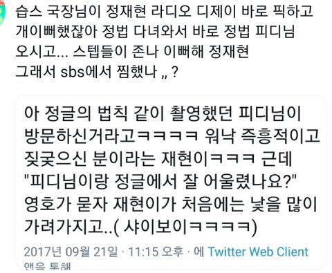 재현 아육대 볼링때도 아육대 코치가 제일 열심히 하는 아이돌이라할정도로 노력파에다가 같이 일하는 스텝들마다 칭찬하고 아끼던데ㅠㅠ엠씨도 노력할거같다 기대...스페셜 무대로 노래도 부르겠지