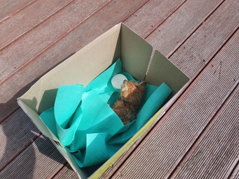 박스에 천을 깔아 털을 말리기위해 밖에 놔두었고 물 조금과 편의점에서 산