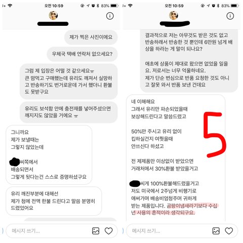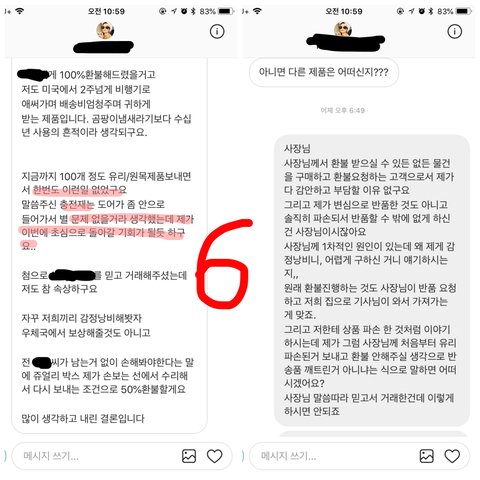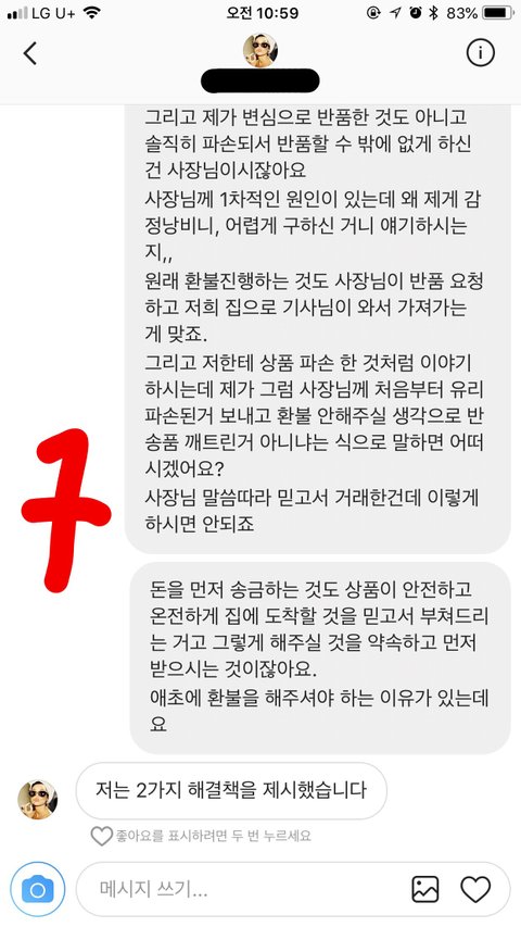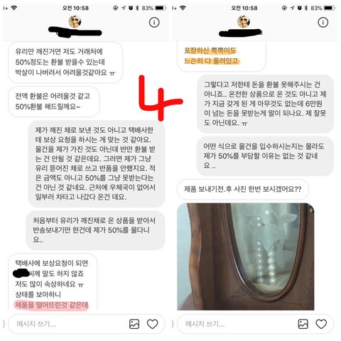 그리고 디엠처럼 자꾸 저희가 상품을 일부러 파손 시켰다 말하기에 반대로 사장님이 반값이라도 벌으려 유리 파손된거 보내고 환불 안해주려 하는거 아니냐고 말하면 기분이 어떻겠냐는 식으로 말했더니 내용을 읽은거 같지도 않더라구요. 저는 두가지 해결책을 드렸습니다 이렇게만 왔어요.