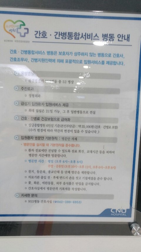 2. 간병에 어려움이 있어서 간병인을 요청하려 했는데 병원에 간호.간병통합서비스가 있어서 신청했습니다. 6인실이 없어서 4인실에 들어갔습니다.