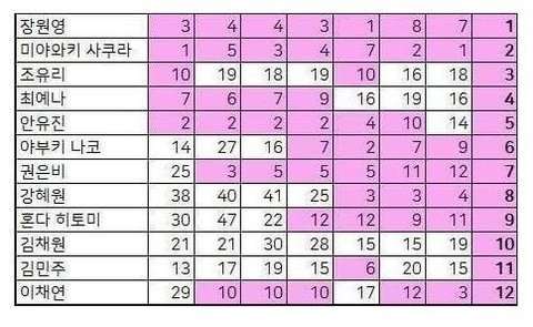 김채원이랑 조유리 등수가 이해안됨 조유리는 막방 3등으로 갑자기 개떡상했고 김채원은 강민희처럼 그동안 데뷔조에 안 들었다가 갑자기 막방 때 데뷔조에 안착함.