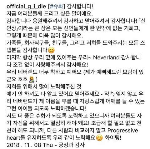 이 글은 신인상 받았을 때 올라온 글인데 마음이 너무 예쁘더라구 슈화가 실력없다고 말하는 사람들이 많은데 실력이 다른 멤버들에 비해 부족한 건 맞지만 연습실 불 끄고 나오는 것도 슈화고 저번 아육대 리듬체조였나 그거 연습하느냐고 온몸에 멍있다고 수진이 말했었던 기억이 있어!