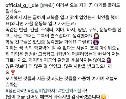 이 글도 너무 좋았어 슈화가 원래 예고에서 연기 전공이었던걸로 아는데 가수가 하고 싶어서 한국으로 온거래! 어린 나이에 한국 와서 힘든 점도 많고 학교가 그립다는 생각도 많이 했을텐데 지금 결정에 후회없고 얻은 게 많다는 슈화야ㅠㅠ