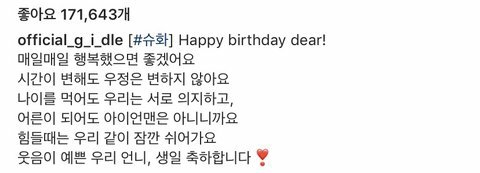 요건 민니 생일에 올라온 슈화의 생일축하글인데 어른이 되어도 아이언맨은 아니니까요 라는 부분에서 머리가 띵했다고 해야할까ㅠㅠ 말도 너무 이쁘게 하고 생각이 정말 깊구나 싶었어!
