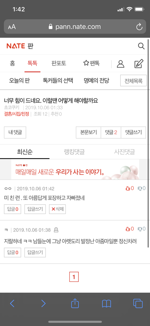 어쩌긴 뭘 어떻게 해요 미친 여편네야. 하여튼 이래서 어디서 어떻게 만났든간에 남녀사이에는 무슨 일이 생길 지 알 수가 없다니까? 미래 내 남편한테는 여자랑 일도 하지 말라고 해야하나? 세상에 반이 여자인데 ㅉㅉㅉ 더럽고 씁쓸하다