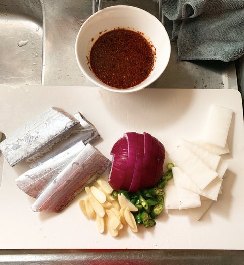 냄비에 얇게 썬 무를 깔아주고 마늘, 양파, 고추, 갈치를