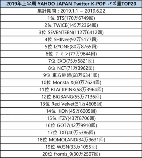 1위 방탄소년단 2위 트와이스3위 세븐틴4위 샤이니5위 아이즈원6위 태민7위 엑소8위 엔시티9위 동방신기10위 몬스타엑스11위 블랙핑크12위 빅뱅13위 레드벨벳14위 아이콘15위 있지16위 갓세븐17위 투모로우바이투게더18위 모모랜드19위 우주소녀20위 프로미스 나인