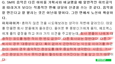 는 히치하이커(SM 전속 작곡가)곡이 어렵고 대중성이 없고 훅이 없어서 곤란하다고 거절하던 곡들을 SM만이 쓰겠다고받아줌곡을 만들어서 들려주고 누구한테 줄지 결정을 하고 여러가지 의견을 주고받는데 SM에서는 한번도 대중적인 코드를 원한적이 단 한번도 없다고 함
