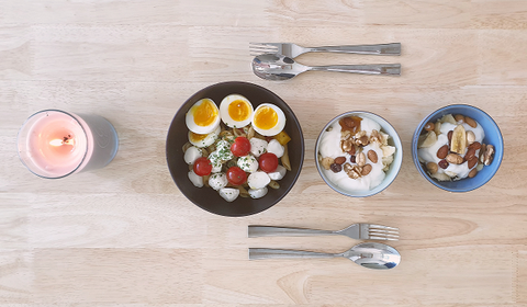 샐러드는 미니 생모짜렐라 치즈를 사서 방울토마토, 펜네 파스타, 야채랑 섞은 후 신혼여행가서 사온 올리브오일과 발사믹식초를 섞어 간단히 만들었음. 남편이 살짝 덜익힌 삶은계란을 좋아해서 7분만 딱 삶아 만듦.