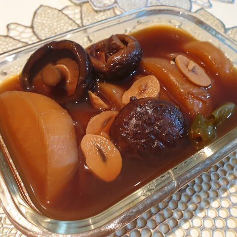 간장+청주+물엿으로 양념하고 양지+표고버섯+대파뿌리+디포리+멸치+무넣고 우린 육수에 섞어 오랜시간 끓이면 달큰하고 맛있는 무조림 완성. 오래 졸일수록 양념이 많이 배어 더욱 감칠맛이 살아남.