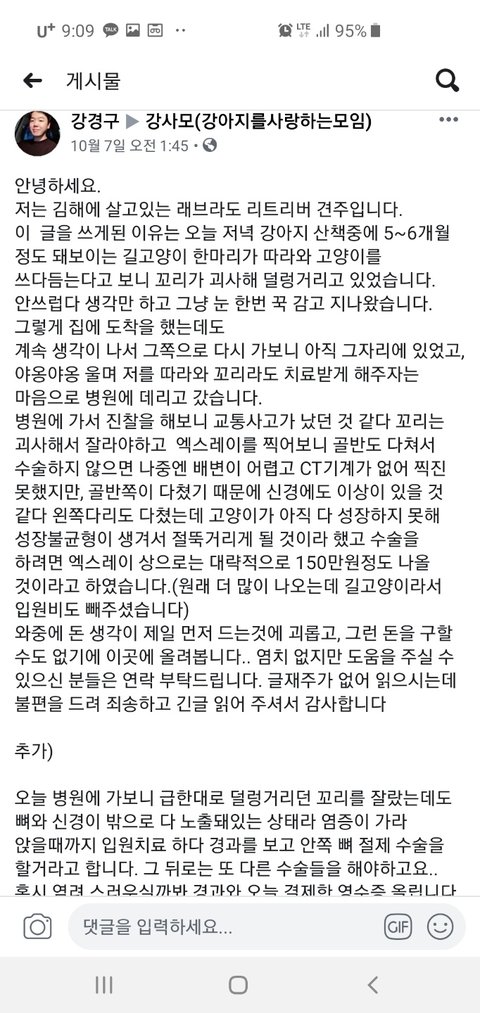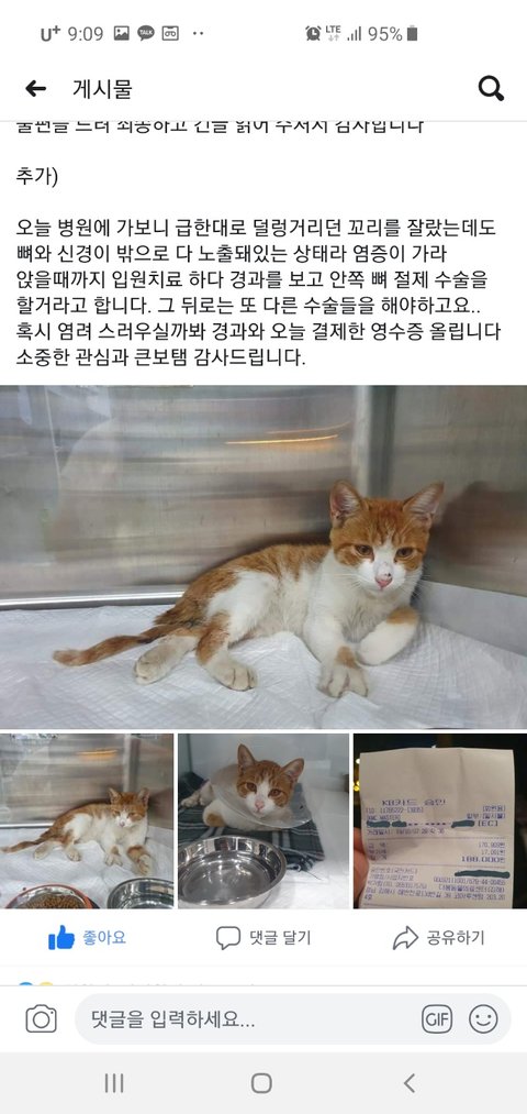 일단 저는 강아지를 밖에서 키우고 있고 고양이를 치료하고 나면 밥과 잘 곳을 마련해 주려고 합니다. 그런데 그건 나중이고 지금 당장은 수술을 해야하기 때문에 조금이라도 치료비 도움을 받고 싶어요. 생판 본적 없는 사람이라 신뢰도 없으시겠지만, 절대 생명으로 장난치는 사람은 아니에요