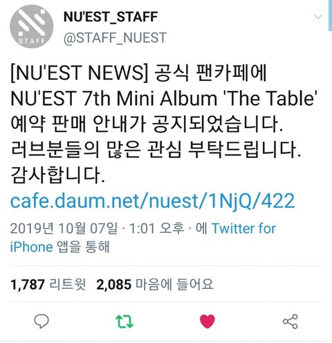하 이제서야 띄우다니 느려! 이제야 본 나도 느려✊ 노네들 공구 공유해줘야한드아!! https://twitter.com/STAFF_NUEST/status/1181056950143832064?s=19