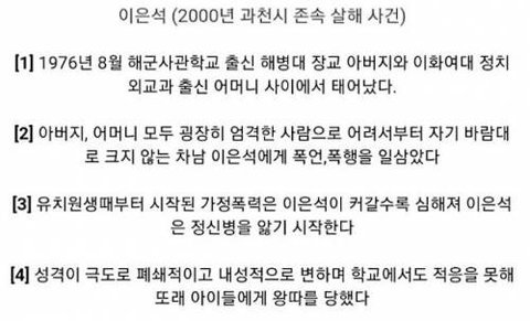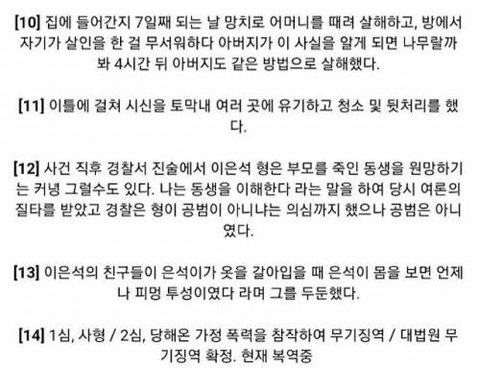 이 사건 후에 부모가 왜 그리 학대했는지 조사해봤는데 부모도 학대받고 성장한 것을 알게 됨 아빠는 첫째만 편애하는 집안에서 차별받고 자란 둘째였고 엄마는 전형적인 스파르타 집안에서 부모의 위신을 위해 살았음 그런 두 사람의 결혼부터 문제였음 사랑이 있어서가 아니라 때가 되었고 집안에서 시키니 결혼을 해서 자식을 낳아 키우는데 자신들이 살아온 환경이 있지 않겠음? 본인들이 당했던 학대를 그대로 자식들에게 물려 주게 됨 심지어 그렇게 살아왔기 때문에 학대인지도 모름 둘 다 그렇게 살아서... 이 사건이 "오죽했으면 자식이 부모를 죽였을까?"를 보여줬지만 동시에 학대는 대물림 된다는 것도 보여주었음