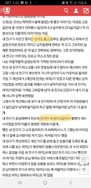 그래서 막 계산하는데 내가 내 친구한테 야 근데 아까 저 직원분들이 너 일진같대 남자후릴거같대 하고 말함 여직들이랑 남직도 다 들리게