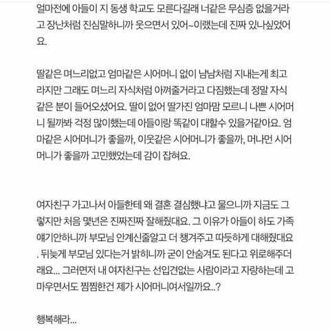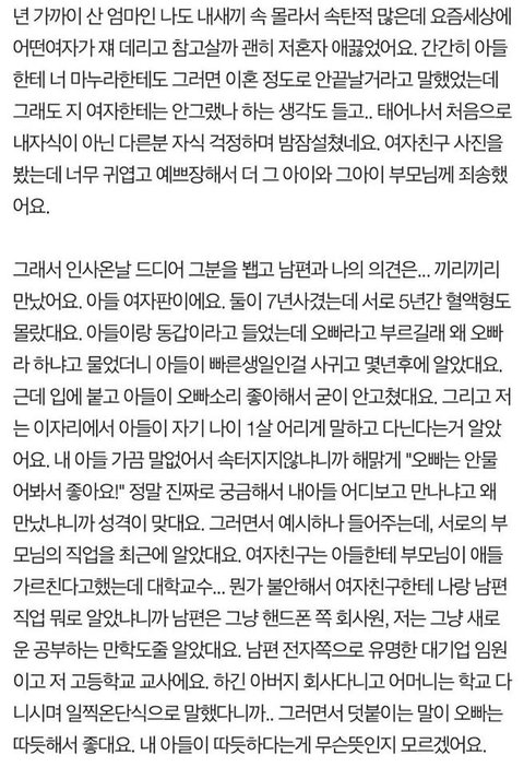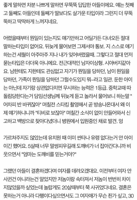 와 내동생이랑 똑같애. 남동생인데 진짜 글에 나온 아들이랑 똑같음. 10년 사귄 여친이 있는건 알았지만 한번도 본적없다가 결혼한다고 처음으로 소개시켜줬는데 진짜 지랑 똑같은 애를 데려왔음. 아니 지보다 더함ㅋㅋㅋㅋ 근데 보면서 둘은 잘살겠다 생각은 들더라~ 행복해라...ㅋㅋㅋ