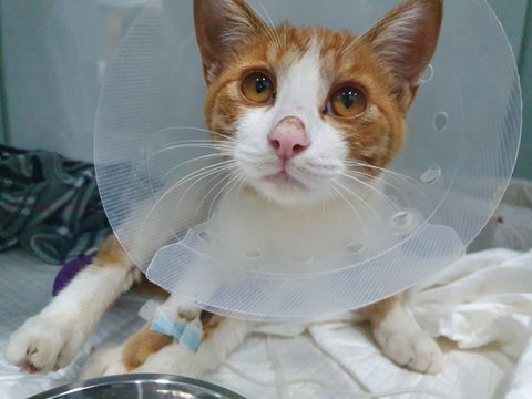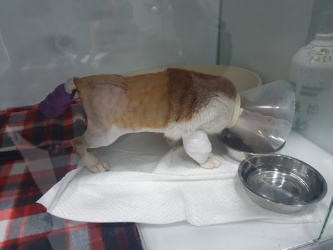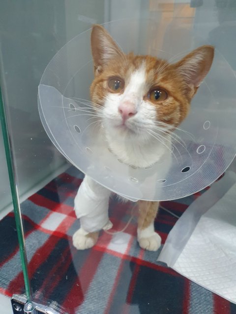 병원에 가서 진찰을 해보니 교통사고가 났던 것 같다 꼬리는 괴사해서 잘라야하고 엑스레이를 찍어보니 골반도 다쳐서 수술하지 않으면 나중엔 배변이 어렵고 CT기계가 없어 찍진 못했지만, 골반쪽이 다쳤기 때문에 신경에도 이상이 있을 것 같다 왼쪽다리도 다쳤는데 고양이가 아직 다 성장하지 못해 성장불균형이 생겨서 절뚝거리게 될 것이라 했고 수술을 하려면 엑스레이 상으로는 대략적으로 150만원정도 나올 것이라고 하였습니다.(원래 더 많이 나오는데 길고양이라서 입원비도 빼주셨습니다)