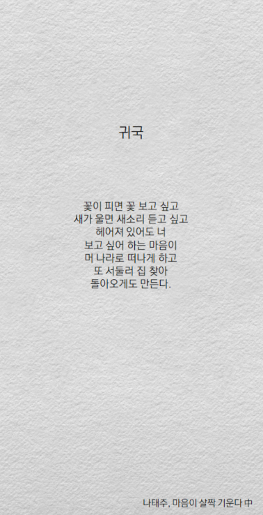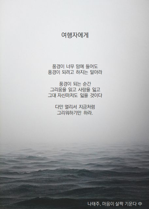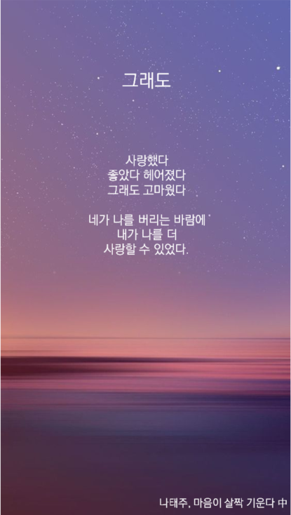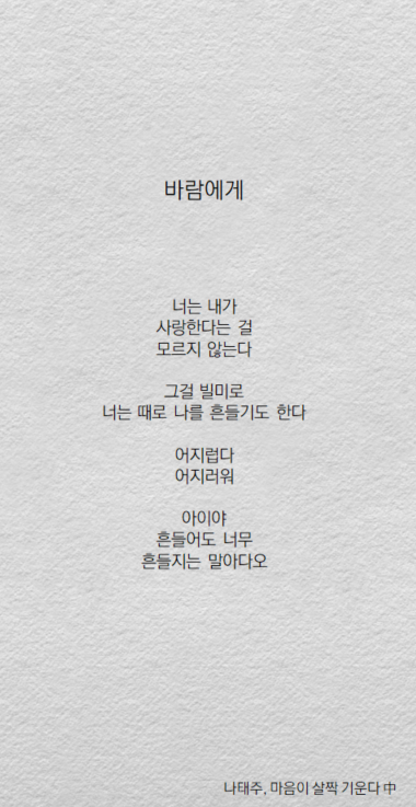 갠적으로 나태주 시인 좋아하는데신작 시 모아놓은 마음이 살짝 기운다 시집 읽다가유독 와닿는 글이 있길래 배경으로 만들어봤음요새 남친이랑 싸우고 헤어졌다가 다시 만났다가 계속 반복중이라마음이 심란한데 위로도 많이 되고 공감도 되고ㅜㅜ선선한 가을바람이랑 시랑 너무 잘 어울리기도 하고ㅎㅎ로맨스는 별책부록에도 나왔던 시집인데우리도 이종석 이나영처럼 달달한 커플 됐음 좋겠당쓸 사람 있으면 가져다 써~!