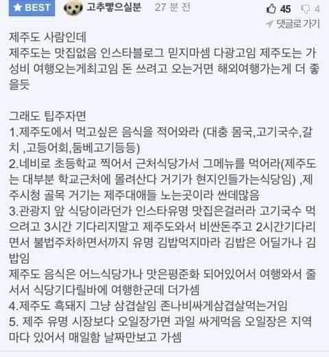 오 이거 ㄹㅇ임 내친구도 제주도 여행갔는데 블로그에서 본 맛집은 그냥그랬고 그냥 길가다가 들어간 평범한 동네 식당?은 존맛이었대 그말들어서 그런지 이글 엄청 공감되네ㅋㅋ
