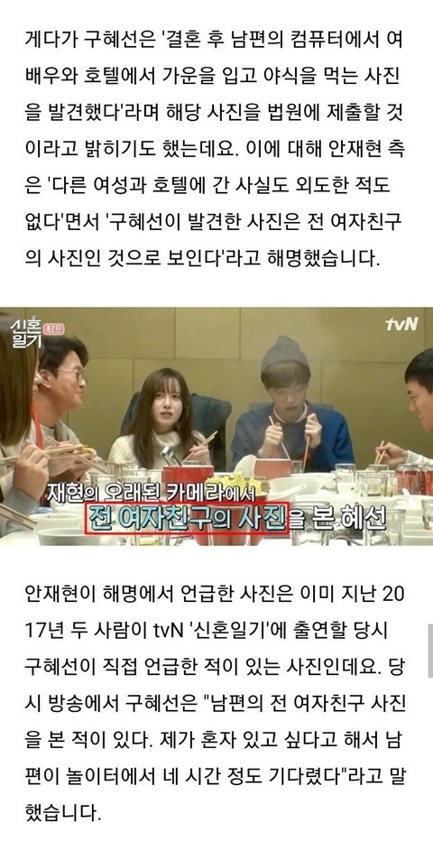 구혜선은 지난달 "정확한 이혼 사유는 안재현의 외도"라며 "현재 촬영 중인 드라마 여배우와 염문설이 너무도 내 귀에 많이 들려온다"고 충격적인 안재현의 염문설을 주장하고 나섰다. 그러면서 '호텔에서 야식을 먹고 있는 증거 사진'도 가지고 있다고 덧붙였다.