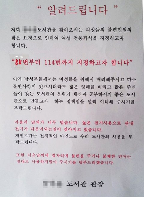 몰카나 성범죄의 위험으로부터 여자들을 보호하기 위한 잘한 조치다 vs 성차별이다로 갈려서 논란중인 도서관 여성 지정좌석
