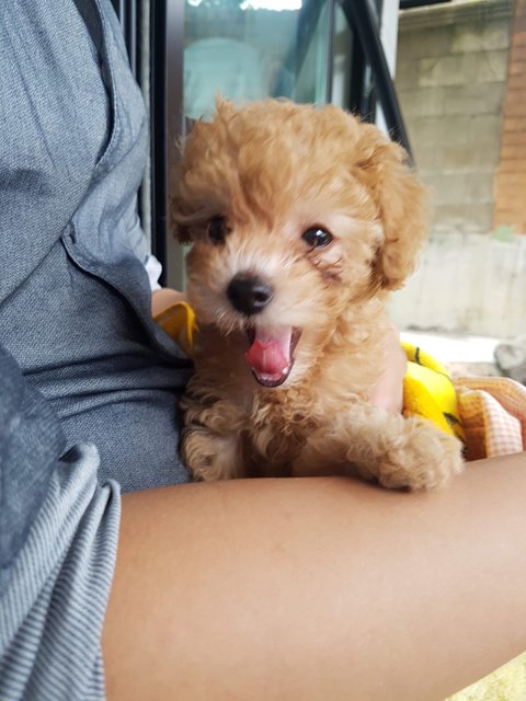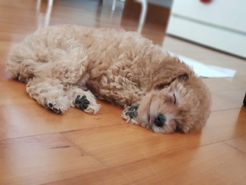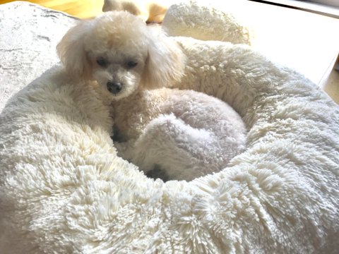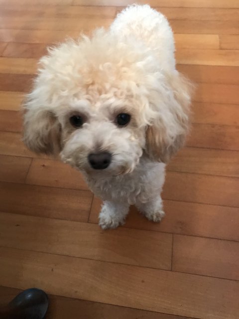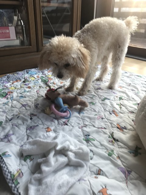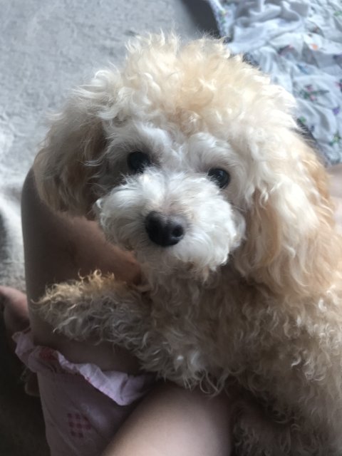 아가때는 브라운이고 주딩이만 하얗더니 점점 크리미로 색이 빠졌어요. 아빠가 크림이고 엄마는 갈색 푸들이에요. 월래 갈색이라 밤 율 자에 율이라 지었는데 율무의 율로 변질? 됬어요