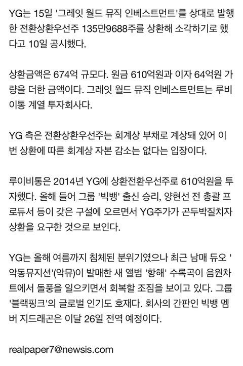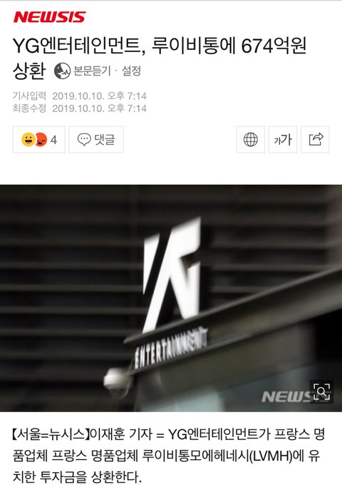 YG엔터테인먼트, 루이비통에 674억원 상환
