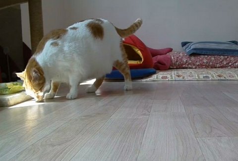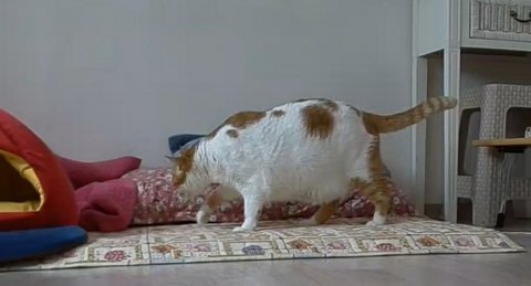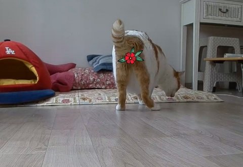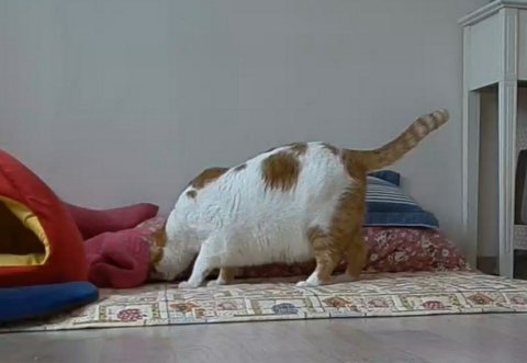 사료를 먹기 위해 엉덩이를 천천히 내리며 자세를 잡고 있음.