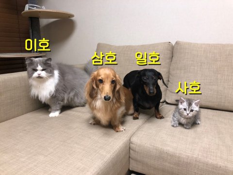 단모닥스훈트 일호 , 스코티쉬폴드 이호 , 장모닥스훈트 삼호, 먼치킨 사호 이렇게 북적북적 하게 지내고있어요
