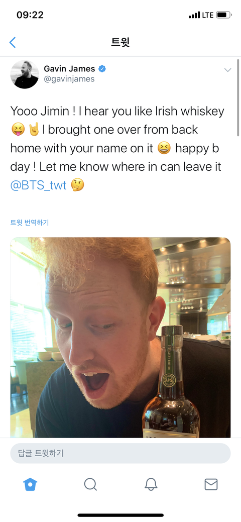 이번에 내한했는데 공연에서 지민이 이야기하고 하더닠ㅋㅋㅋㅋㅋㅋ 지미미 아이리싀 위스키 좋아한다고 해서 고향에서 지미미 이름 박아서 들고왔다고 어디로 전달해야되는지 알려달랰ㅋㅋㅋㅋㅋㅋㅋㅋㅋㅋ 사실상 우정은아이리쉬밤즈가 좋아하는거지만 지미미 좋겠다 ㅌㅌㅋㅋㅋㅋ