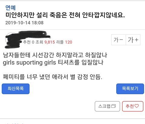 한남탓이라고 발뺌하지마 설리 인스타 하나하나 중계하면서 설인업 이지랄 떤거 여자임 지금도 남돌이 상탈하면 핫바디 운운하고 야한옷 야한안무 하면 배운변태 드립치고 놀면서 며칠전에 아이들 수진은 조카 욕한게 판녀임 진나빛이 난리칠때 진나빛이 진리인양 몇날 며칠을 깐것도 판이잖아