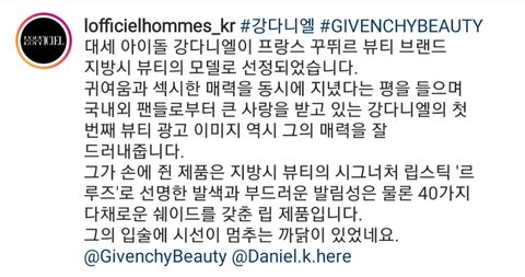 https://www.instagram.com/p/B3mEedFhDxl/ 대세 아이돌 강다니엘이 프랑스 꾸뛰르 뷰티 브랜드 지방시 뷰티의 모델로 선정되었습니다.