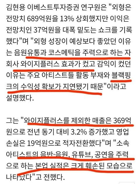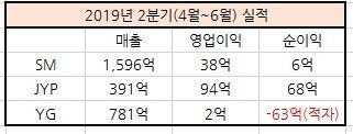 주요 소속사중 유일하게 적자난 yg