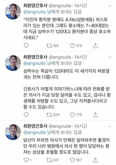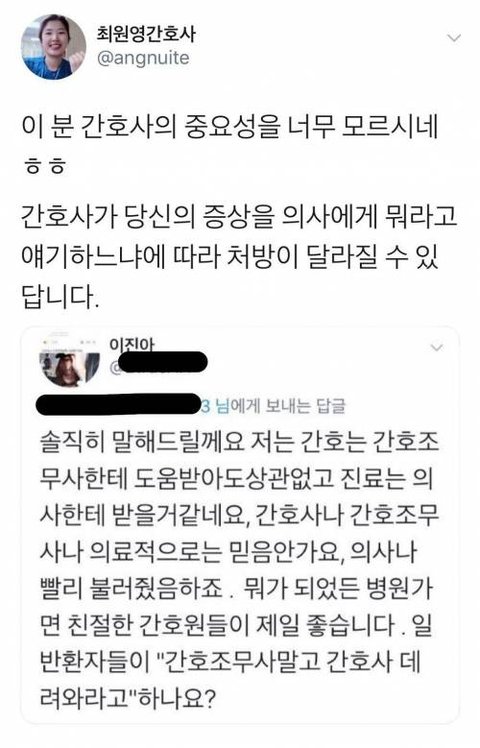 저거 정말 중요한 부분임. 간호사가 주어진 상황에서 중요 포커스를 잡고 의사에게 알리고 그에 따라 산소마스크 적용 등 초기대처를 할 수 있음. 질환의 중증도가 낮은 의원급에서는 큰 차이를 느끼기 어려우나 입원을 요하는 질환의 경우 간호사의 수준이 환자가 받는 의료의 질을 결정한다고 생각함.