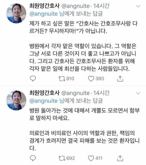 대학병원 간호사인데요 .. 정말 공감이네요. 저도 근무하면서 환자분들 중에 연세많으신 분들.. 간호사에게 반말은 기본이고 무시하는 발언 상당히 자주 들어요 .. 그럴때마다 속으로 ‘내가 당신 생명에 얼마나 깊이 관여하고 있는지 알면 저런소리 못할텐데’ 라고 생각합니다 ...