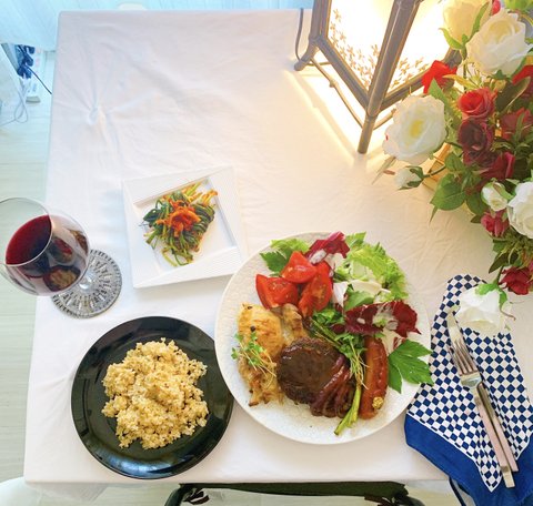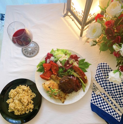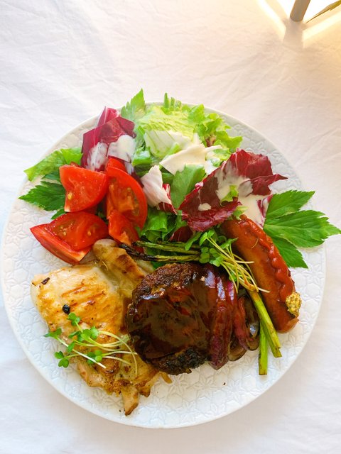 믹스 그릴이 먹고 싶어 닭가슴살 껍질 벗겨 소금, 후추, 향신료, 요리술에 30분 정도 재워 소세지와 패티, 야채와 구워낸다.