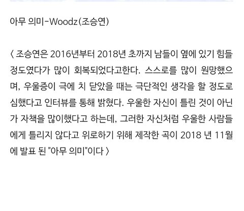 야.. 무조건 우울증=자살 이건 아니야ㅋㅋ.. 슬프고 우울한 본인 모습도 굳이 지워낼 것 없이 본인이라고 받아들이는 사람이 있는 거야 조승연처럼.