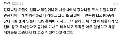 강다니엘까들은 프듀악개들답게 조직적으로 움직여 ㅍ갤 가보면 강다니엘 기사마다 악플 댓관하고 광고나 좋은 소식 들려오면 업주에 전화 테러하고 지들끼리 인증도함 남의 사진 도용해서 계자인척 주작하고 홈마사진 필터 넣어서 원본이라 주작하고 그냥 주작이 일상이고 자기네들 주작을 무슨 종교처럼 신봉하고 다님 찐정병들이라니까