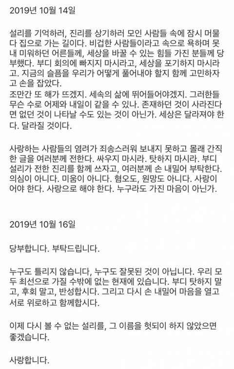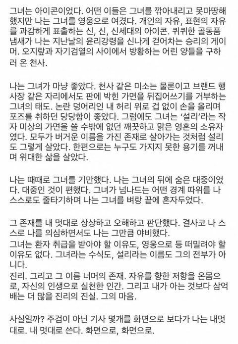 전부터 느끼는건에 유아인은 글을 잘 쓰는 것 같다 정말 아끼는게 눈에 보이네 고인에 대한 예의도 잘 지켰고 설리가 더 반짝이는 별이 된 것 같아 그곳에선 예쁜 것들만 보길 바랄게 고생 많았어 진리야