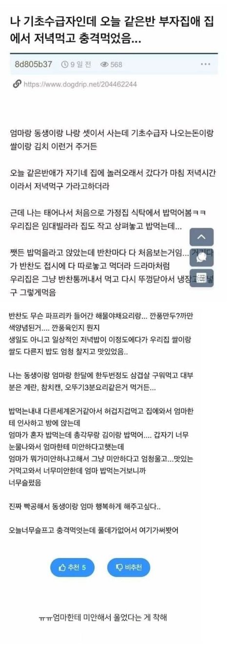 나 기초수급자인데 부자친구집에서 저녁먹고 충격먹음