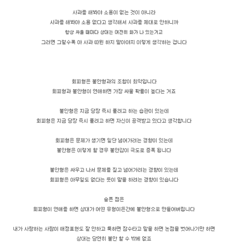 회피형의 가장 큰 단점은 상대를 조금씩 조금씩 파괴시킴 어떠한 형태로든 그게 물질적인거일수도 정신적인거일수도 육체적인거일수도있음.