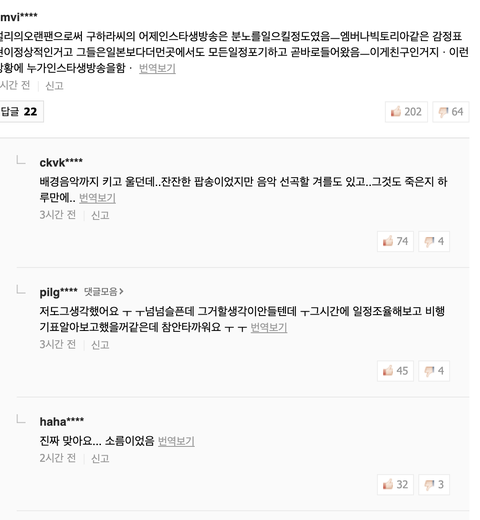 저게 악플인가? 상식적으로 생각해봐라. 니 친구가 죽었다고 가정해보자, 근데 다른 친구가 라이브켜서 울면서 애도를 표하는거야. ㅈㄴ 소름돋을거같은데. 애도를 누구 보여주려고 하는건가?