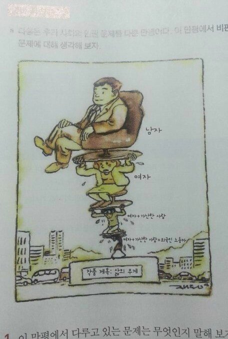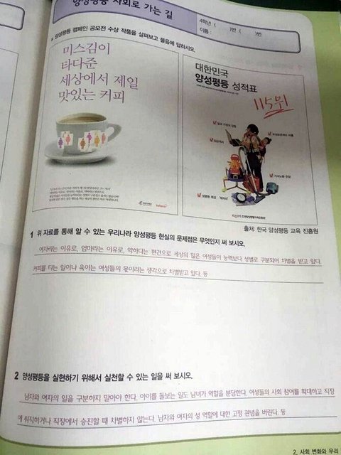 남자들은 무조건 편하고 여자들은 무조건 힘들다고 주입하는 잘못된 교육으로 보이는데요. 아무리 봐도 많이 한쪽 성별에 편파적인데요? 특히 WEF에서 발표한 양성평등순위 115위는 친여성 성향의 JTBC에서조차 문제가 있는 통계라고 조목조목 지적했을 정도로 비현실적인데 여자아이들의 피해의식을 너무 어린 나이부터 부추기는 것 같아 안타깝네요. 아들 가진 부모들은 저거보면 무슨 생각을 할지;;;;