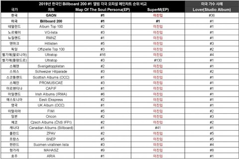 방탄 슈퍼엠 세계 차트 비교 표