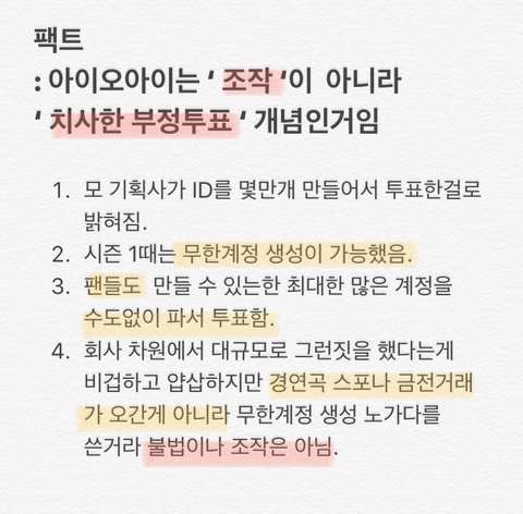 때문에 팬들도 트위터부터 시작해서 가능한 최대한 많은 계정을 끊임없이 생성해서 자기가 응원하는 연습생을 투표했음. 즉, 아이오아이 활동겸업이 계약서에 명시돼있지 않아서 활동 가능했던것처럼 치사하고 옹졸하지만 ‘불법’이나 ‘조작’은 아니라는 말임.