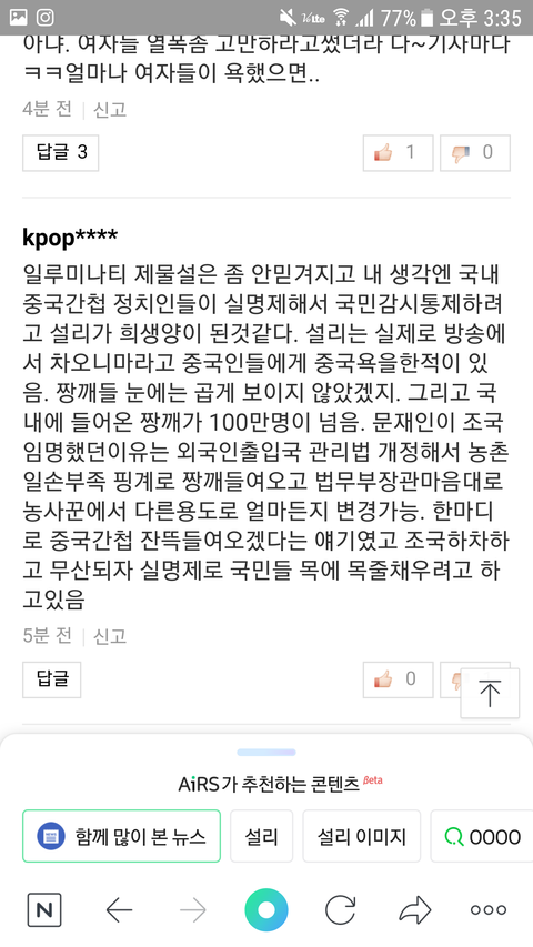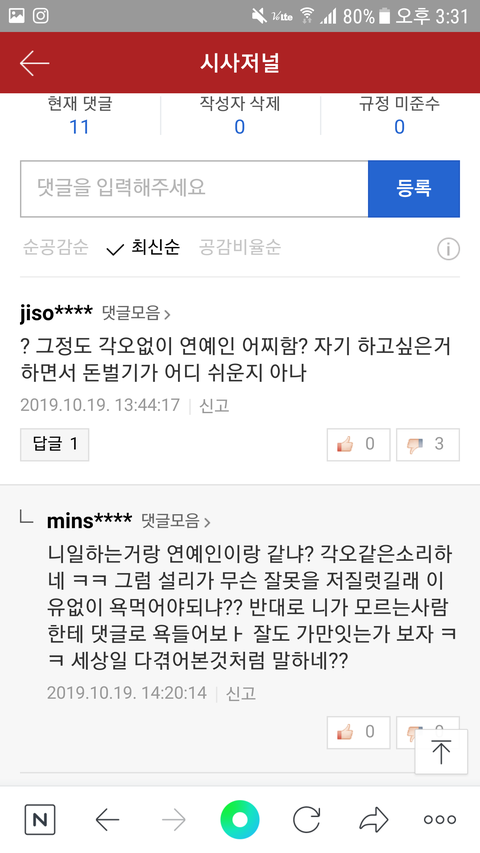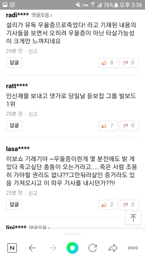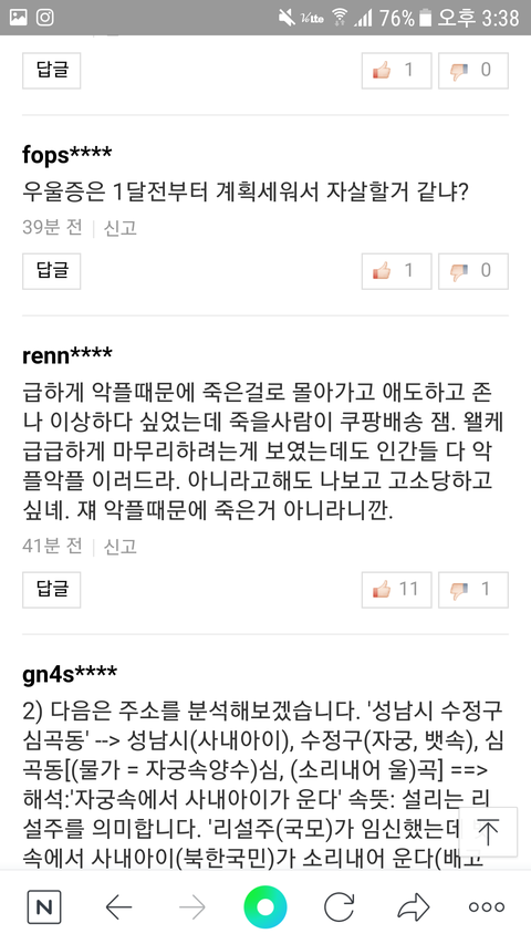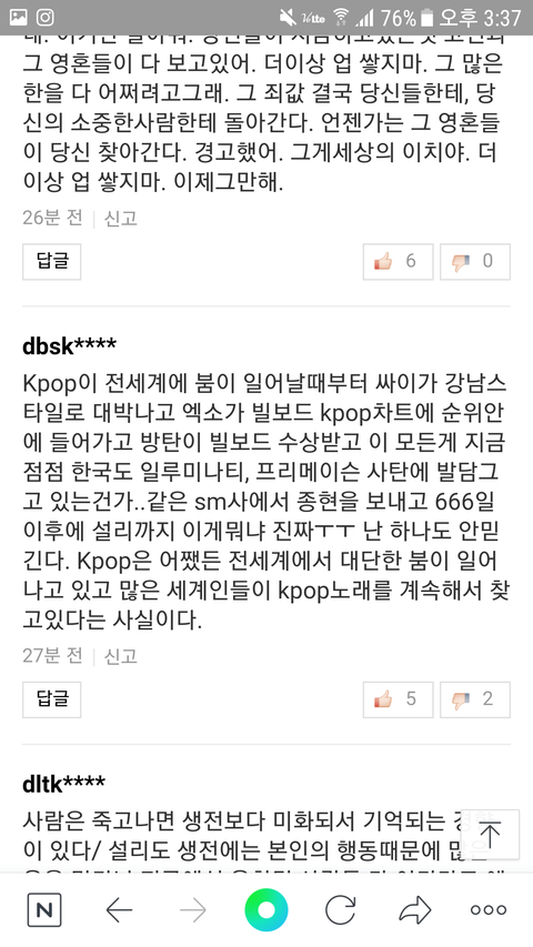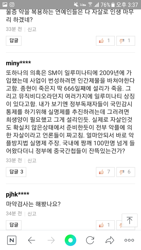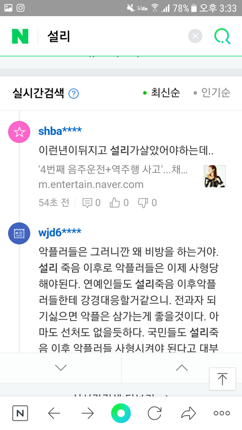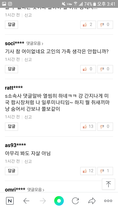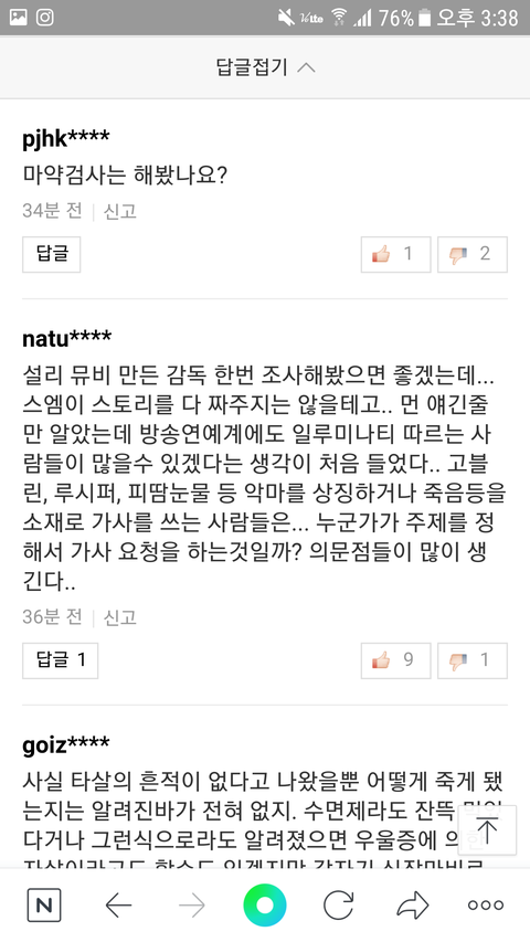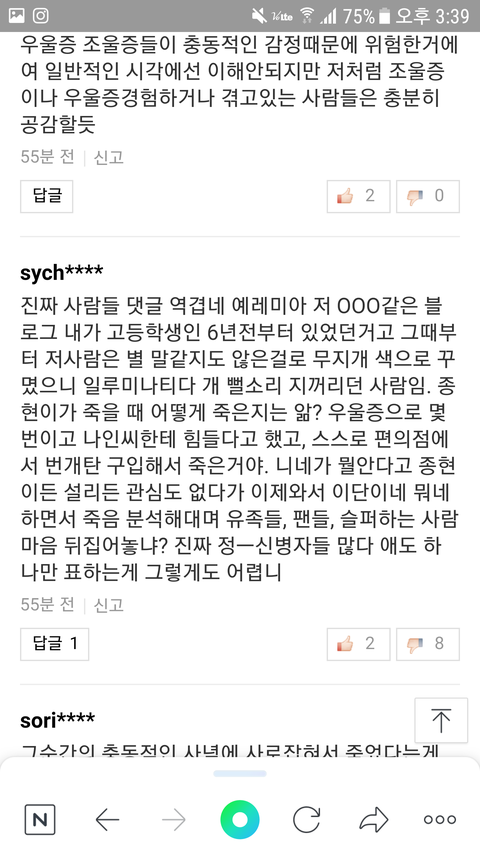 저 댓글을 쓴게 같은 인간이 맞나싶고 그 와중에 이성적인 댓도 보이네....이 와중에도 다른 연예인들한테 가서 악플 다는거 좀 봐....정말 소름끼친다.대한민국 사회가 이렇게 병들었었나 환멸나 진짜 우울증 올것 같아 이미 조울증 온것 같아서 미치겠다 ㅜㅜ