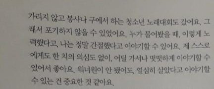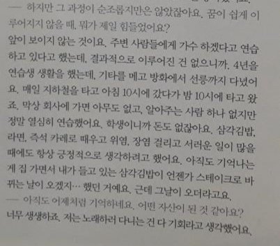 "저는 노래하러 다니는 건 다 기회라고 생각했어요... 그래서 포기하지 않을 수 있었어요. 누가 물어봤을 때, 이렇게 노력했다고, 나는 정말 간절했다고 이야기할 수 있어요. 제 스스로에게도 한 치의 의심도 없이, 어딜가서나 떳떳하게 이야기할 수 있어서 좋아요."