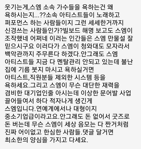그 회사에 가수 팬/스엠 알바ㄴ아 라는 댓글 보고 빡이 거하게 쳐서 댓글 와다다 써버림...나는 진짜 많은 아이돌을 좋아했고 심지어 ㅂㅌ도 좋아했던적 있어서 더 팬덤 싸움에 환멸남.도대체 ㅇㄹ분들한테 내 가수 듣보잡 소리 들었던 내가 어떻게 스엠덕이 되었나 궁금하기도 하고..